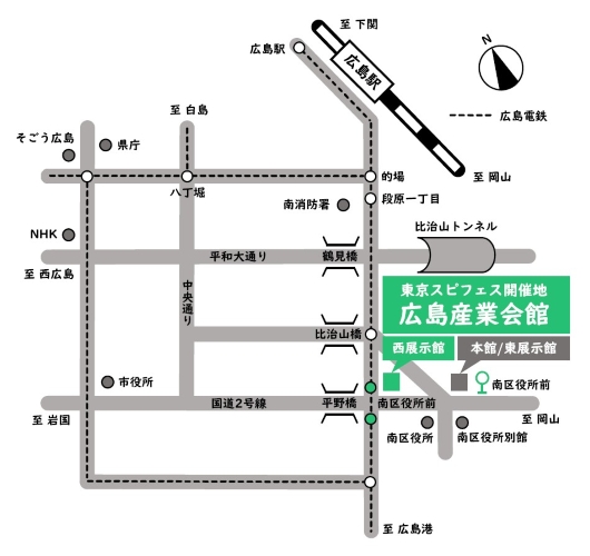 JR広島駅(南口)から広島電鉄5番のりば(比治山下経由広島港(宇品)行き)で約10分