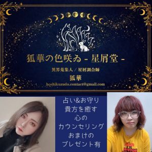 狐華の色咲ゐ-星屑堂- ◆ルノルマンカード 1回 3,000円 ◆お守り 各種 3,000円~ ◆お守りくじ 1,500円 ◆手作りのお守り 1,500円 ◆星香販売 1,000円? 星屑堂は悩める人が辿り着く場所、占い師の狐華による心を楽にするカード占い、カウンセリング、アロマ、自分だけのお守りが作れる天然石のワークショップ、意味を込めて浄化した天然石のお守りの販売をしています。 ※スタンプラリー景品ご提供ございます♪ |